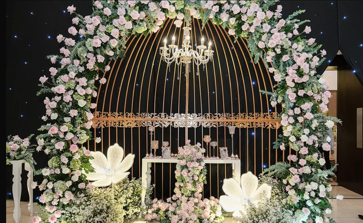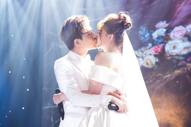Thu Thủy và chồng - Kin Nguyễn - chọn tông trắng và hồng làm màu chủ đạo cho “thảm hoa” này khiến bữa tiệc càng thêm phần thanh khiết và lãng mạn hơn.
